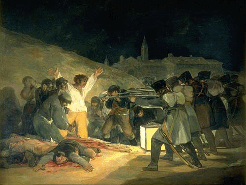 Napiszę też w ten sposób, że trudno wyobrazić sobie niestety dzieje ludzkości bez wojen. Ale sztuka czerpiąca inspirację z wydarzeń wojennych ma też często wymowę antywojenną lub patriotyczną. Weźmy świetny obraz jaki namalował Goya „Rozstrzelanie powstańców Madryckich”. Główny bohater unosi ręce na znak litery V jak Victoria, czyli zwycięstwo.